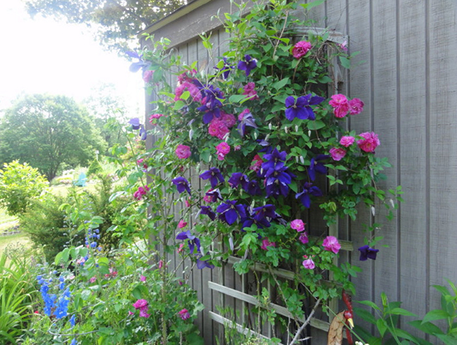 Контрастирующие цвета оживляют посадки и усиливают колорит роз.